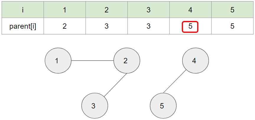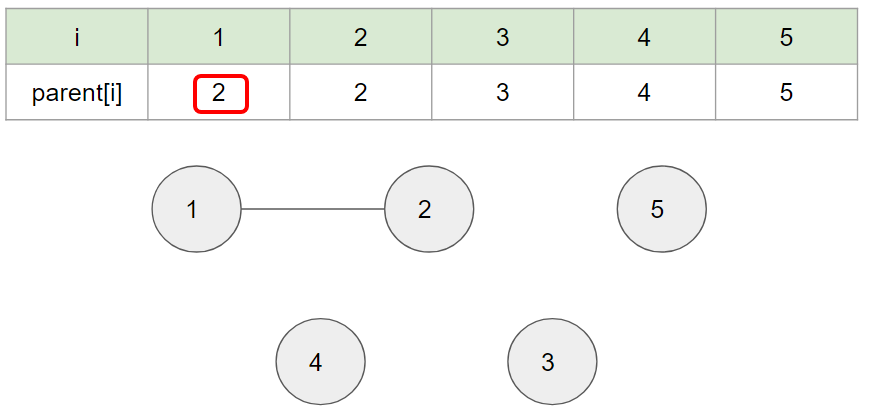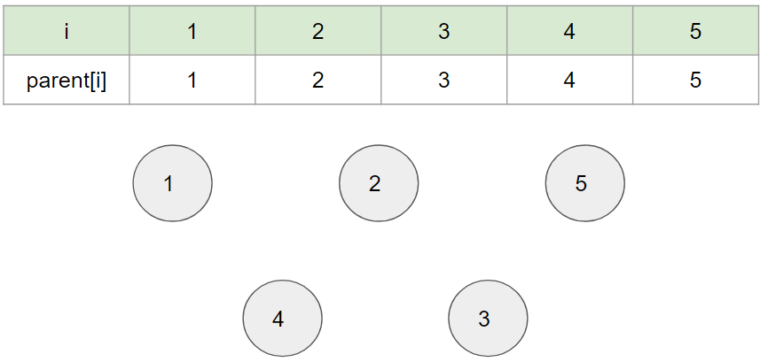 아래 표의 i는 '노드 번호', parent[i]는 '부모 노드 번호'를 의미한다 ( 자신이 어떠한 부모에 포함되어있는지를 나타냄)