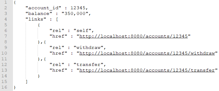 계좌번호가 "12345"인 계좌의 정보를 조희 하는 경우에 해당 계좌의 상태 ( 잔여 금액 등등..)에 따라 접근 가능한 추가 API들이 LINKS라는 이름으로 제공된다.