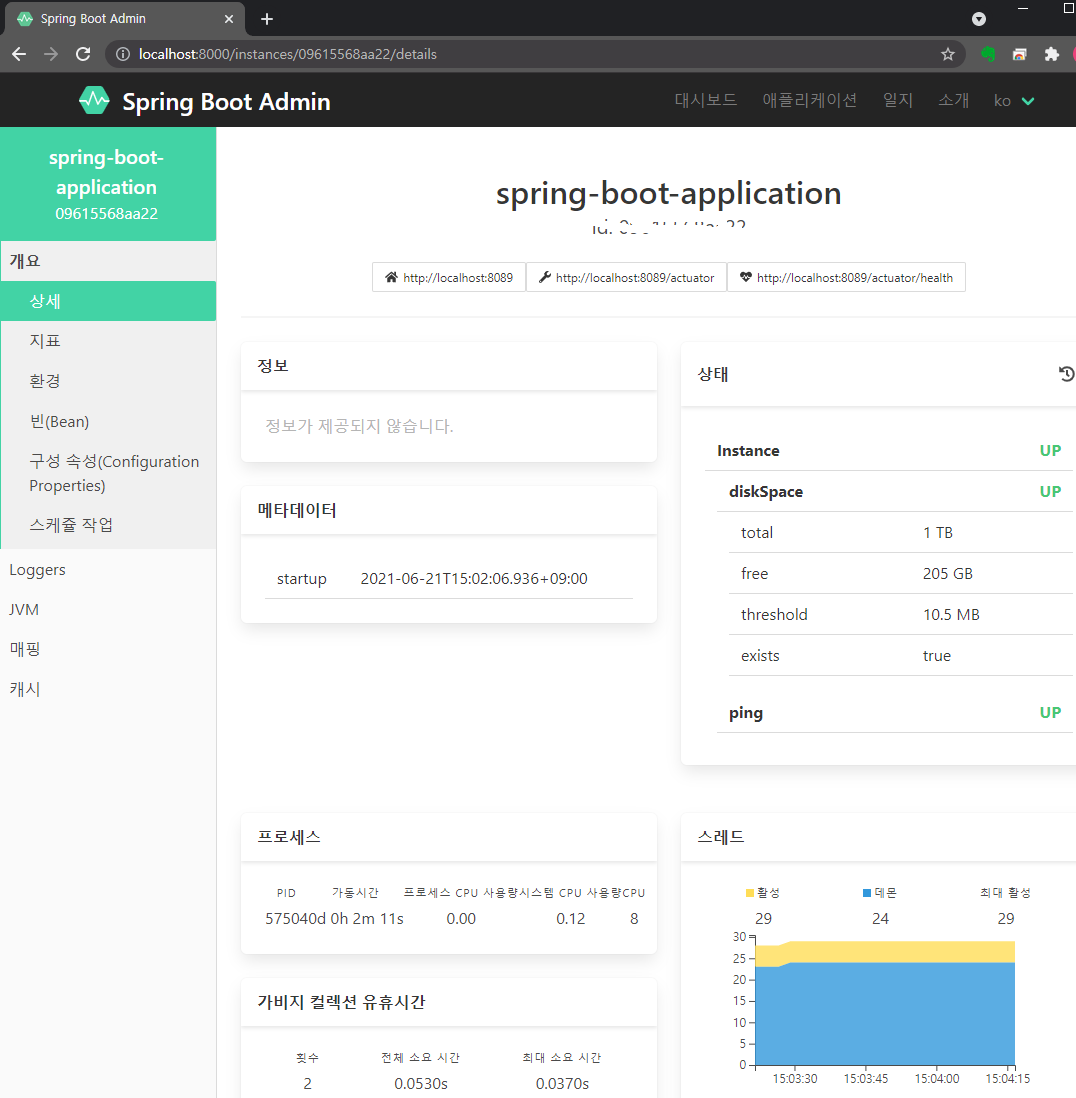 해당 화면에 보여지는 정보는 Spring Boot Actuator를 통해 받은 정보이다.