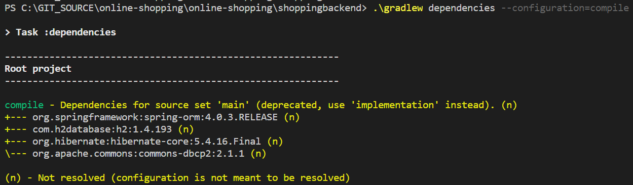 다음으로 cmd창에 gradle dependencies라고 치면 기본으로 gradle에서 제공하는 task로 해당 프로젝트에서 사용하는 dependency를 확인할 수 있다.