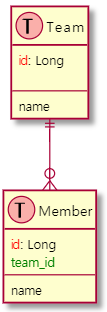 Member, Team Entity가 존재하고 Member는 하나의 Team에 속할 수 있고 Team은 여러 명의 Member를 가질 수 있다.