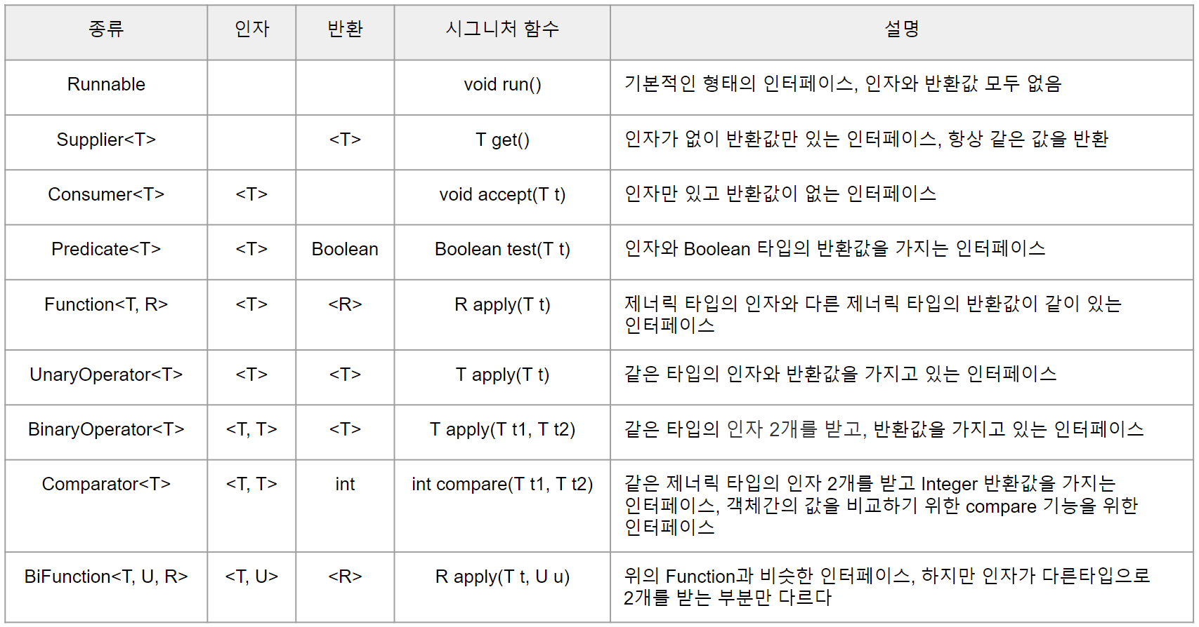 자바에서 기본적으로 제공하는 함수형 인터페이스는 다음과 같은 것들이 있다